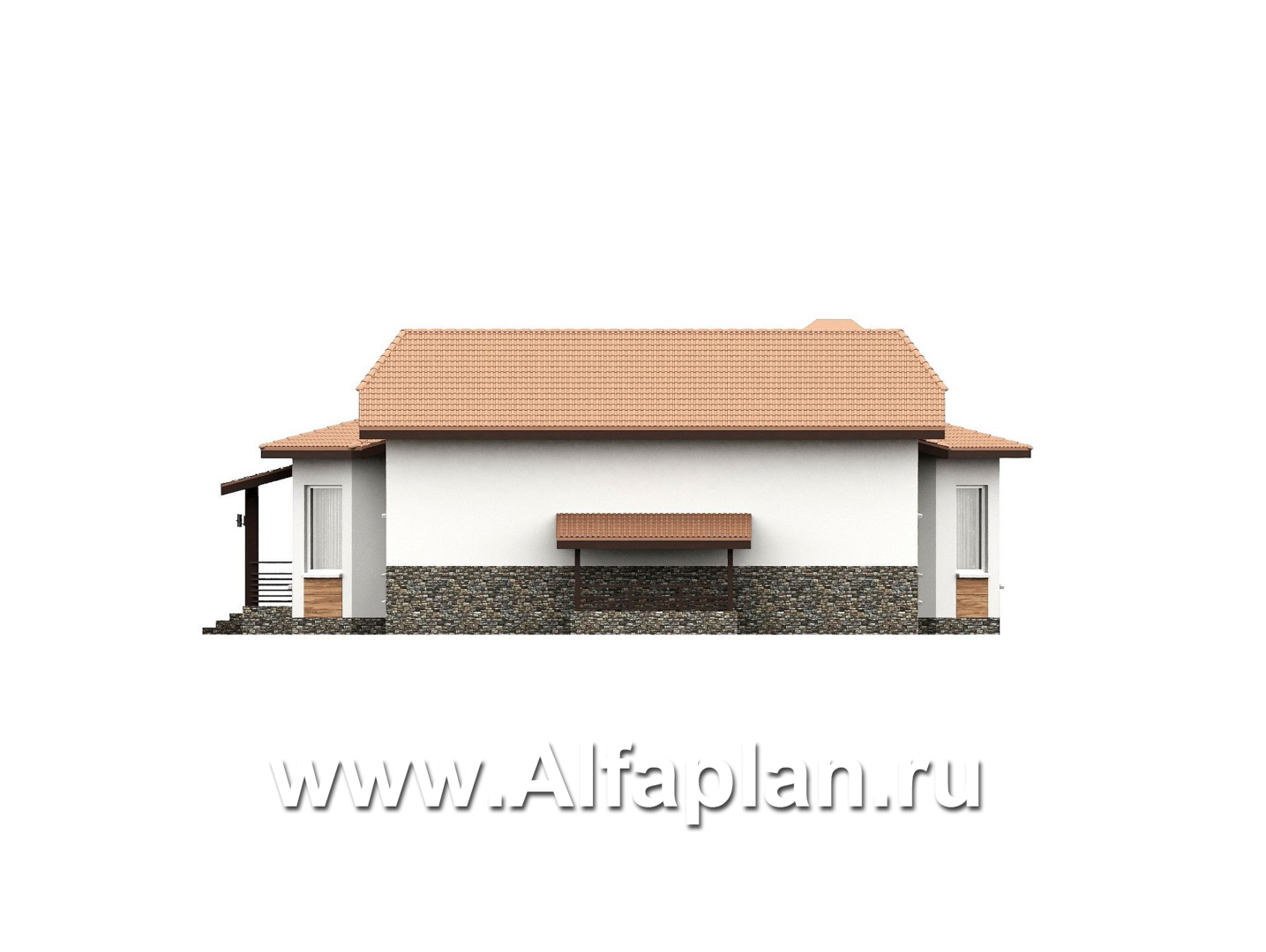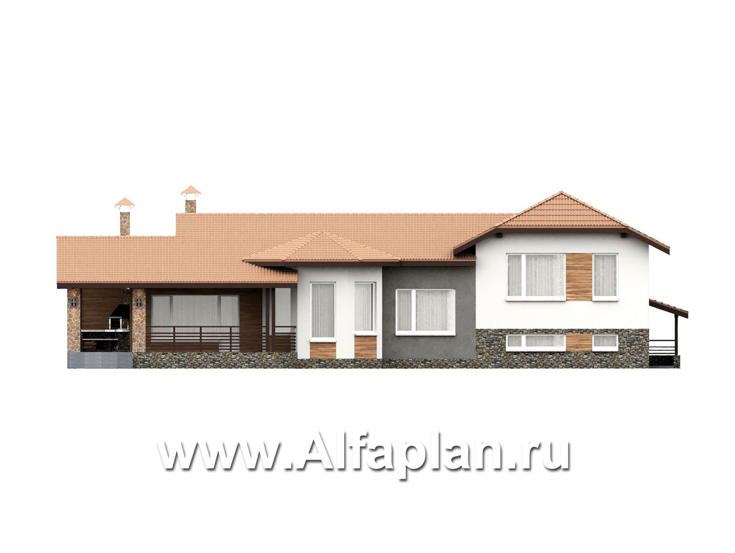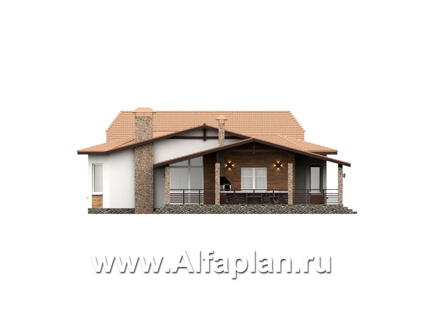 730B-S «Ной и команда» - проект полутораэтажного коттеджа, планировка мастер спальня, с эркером и с террасой, с сауной в цоколе