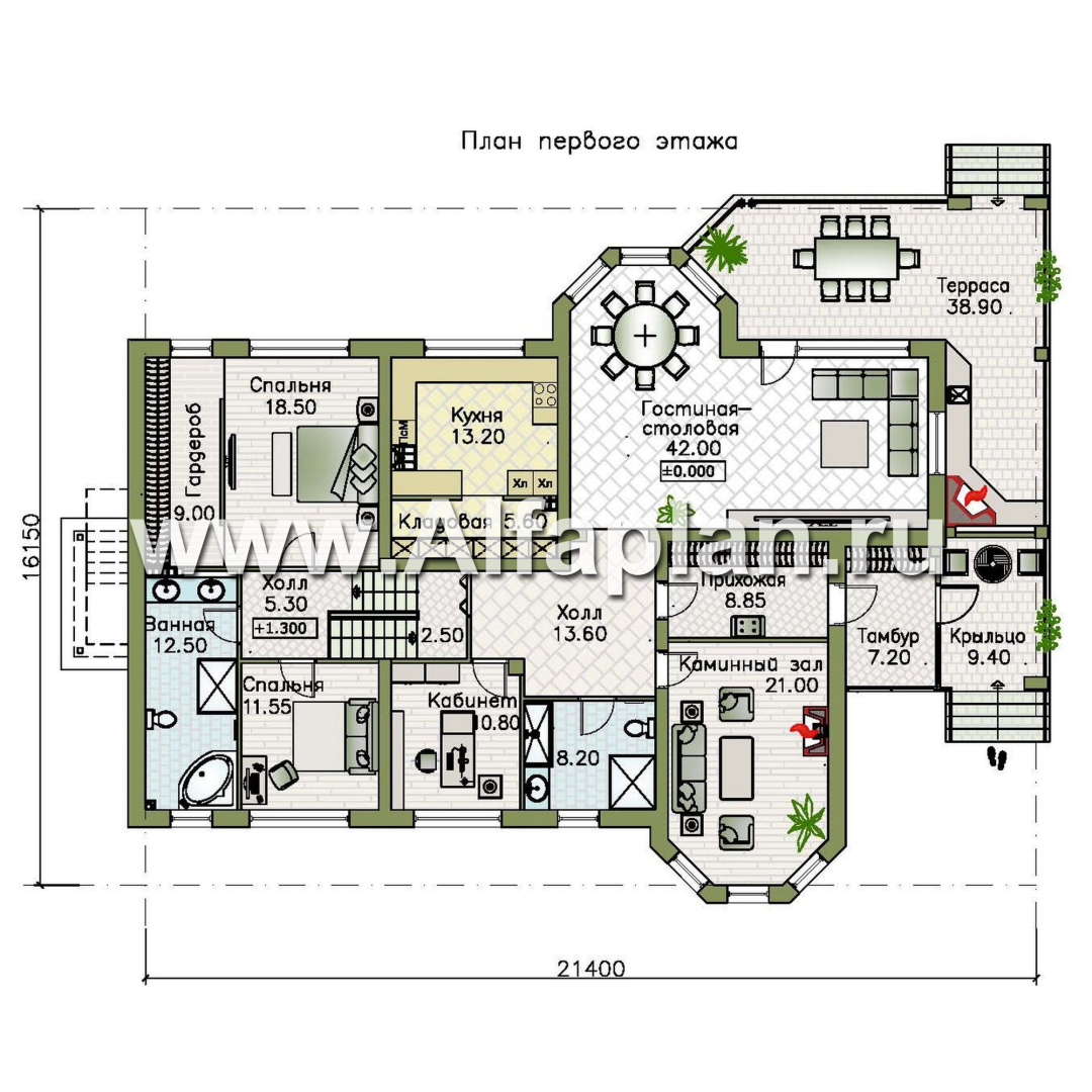 На первом этаже имеется холл, прихожая, туалет, санузел с душевой кабиной, небольшая кухня, просторная гостиная-столовая с камином, три спальни (одна с личной гардеробной). С задней стороны здания к гостиной прилегает крытая терраса, через которую предусмотрен запасной вход в особняк.