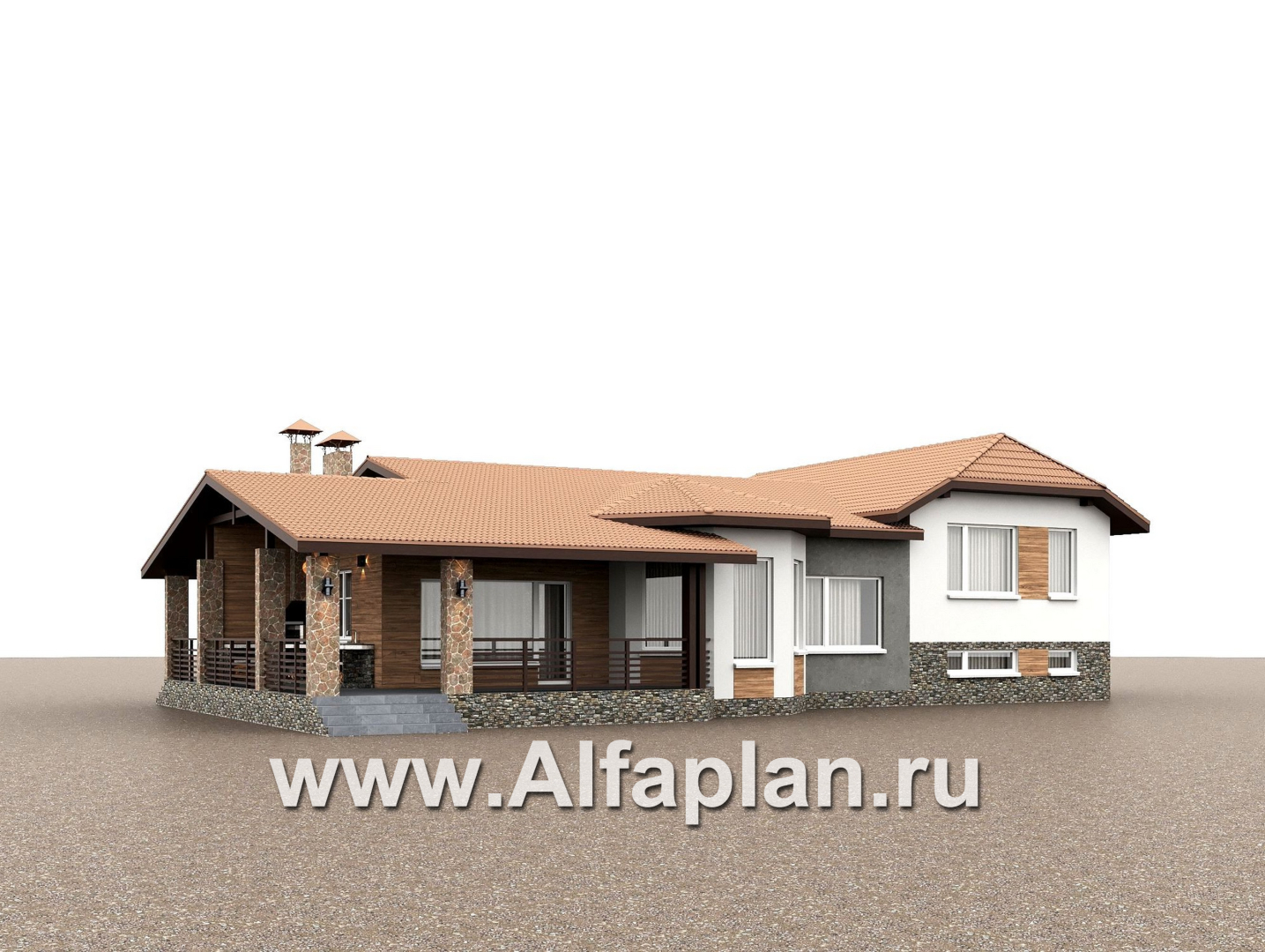 Этот коттедж внешне выглядит довольно небольшим, но внутри имеется почти 300 кв. м. площади, причем третья часть от общей территории – жилые комнаты. Образ одноэтажного здания обманчив: по проекту здесь размещается целых три этажа (включая мансарду и цоколь). Игра шоколадных оттенков облицовочных материалов и кровли выгодно подчеркивается массивными колоннами возле крыльца и декором из крупного камня.