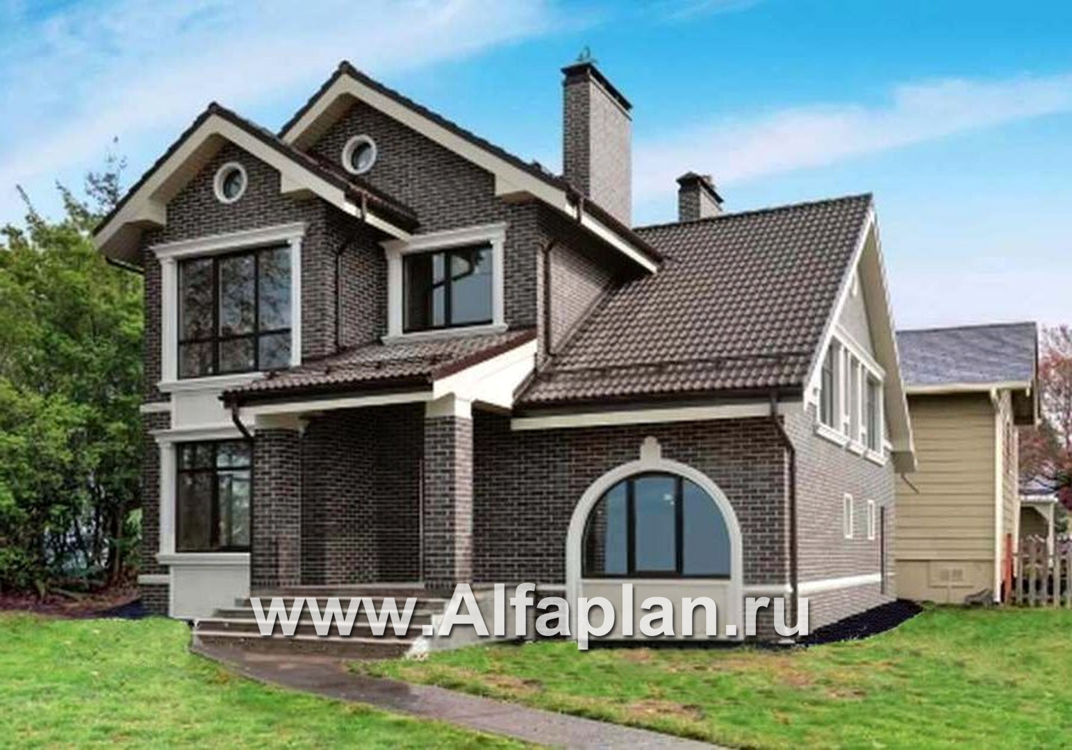 154B-S «Дженни Врен» - проект двухэтажного дома из кирпича с фото, планировка с эркером и сауной, в русском стиле