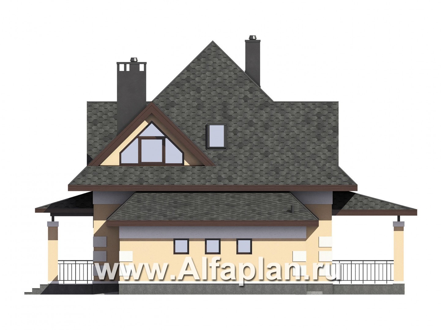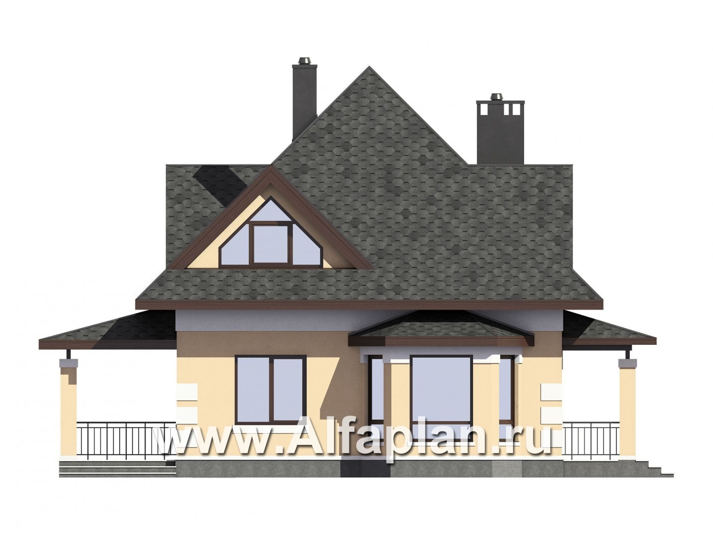 Проект дома с мансардой, 3 спальни, открытая планировка с камином и эркером, гостевая комната на 1 эт и гараж на 1 авто